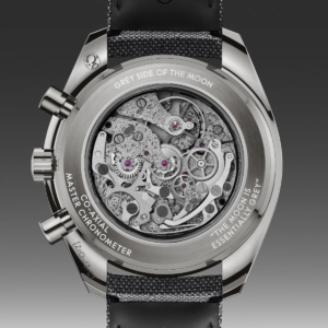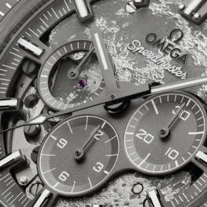 Il quadrante in alluminio anodizzato grigio, parzialmente scheletrato, permette di intravedere il calibro Omega Co-Axial Master Chronometer 3869, una versione decorata del 3861 montato sui Moonwatch. Le incisioni, realizzate tramite ablazione laser, rappresentano la superficie lunare: la faccia visibile è riprodotta sul lato del quadrante, mentre il lato nascosto appare sul fondello, dove campeggia anche la celebre frase di Jim Lovell, “The moon is essentially grey”. Sfere e indici grigi con SuperLuminova bianca assicurano una leggibilità ottimale.