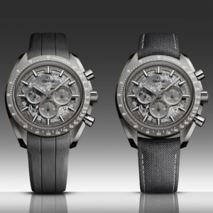Per i nuovi modelli Dark Side e Grey Side of the Moon, Omega ha sviluppato due nuovi cinturini: uno in nylon con rivestimento interno in caucciù e uno in caucciù con motivo “lunar surface” sul lato interno.