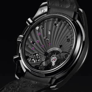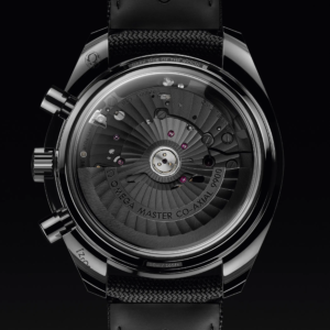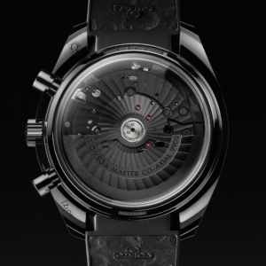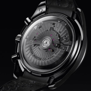 Il movimento rimane il Co-Axial Master Chronometer 9900, ma in una speciale finitura Black Edition: rotore e ponti bruniti opachi con incisioni laccate nere.