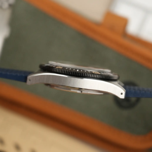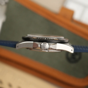 La cassa ha un design riconducibile allo stile tipico degli skin diver anni ’60 e in questa versione presenta una qualità generale e delle finiture nettamente superiore rispetto a quella della generazione precedente di Wolbrook. La superficie superiore delle anse e i fianchi sono satinati e sono separati da dei biselli lucidi che corrono su entrambi i lati e arrivano anche in corrispondenza delle spallette proteggicorona. Personalmente avrei preferito una satinatura longitudinale sui fianchi rispetto a quella trasversale, ma è invece apprezzabile la presenza del bisello lucido anche sulla parte inferiore della carrure che contribuisce a ridurre visivamente lo spessore complessivo, comunque piuttosto limitato.