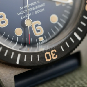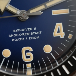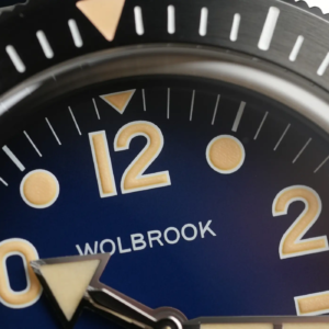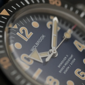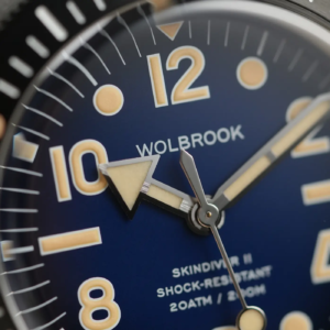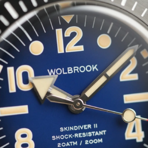Il Wolbrook Skindiver II Automatic è disponibile in 3 diverse colorazioni, più altre due configurazioni con una grafica del quadrante leggermente differente. Nella versione blu scelta per questa recensione il quadrante ha una bella colorazione degradé blu scura al centro che si scurisce man mano fino ad arrivare al nero nella parte più periferica, con una finitura superficiale lucida. Le scritte non sono molte, una scelta azzeccata viste le dimensioni importanti della grafica degli indici. Questa non è un’esclusiva di Wolbrook ed è presente anche su altri skin diver anni ’60, ma ha un indiscutibile fascino rispetto ad altre soluzioni più minimaliste. I numeri e i pallettoni sono realizzati in SuperLuminova Old Radium e contrastano alla perfezione con la colorazione scura del quadrante. Questa versione è sprovvista della finestra della data, che invece in altre configurazioni è posizionata tra ore 4 e ore 5.