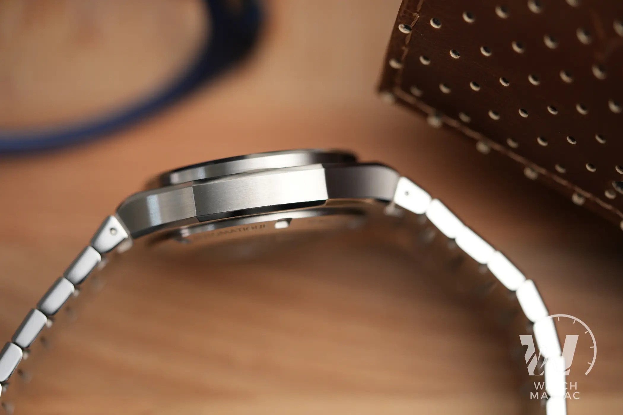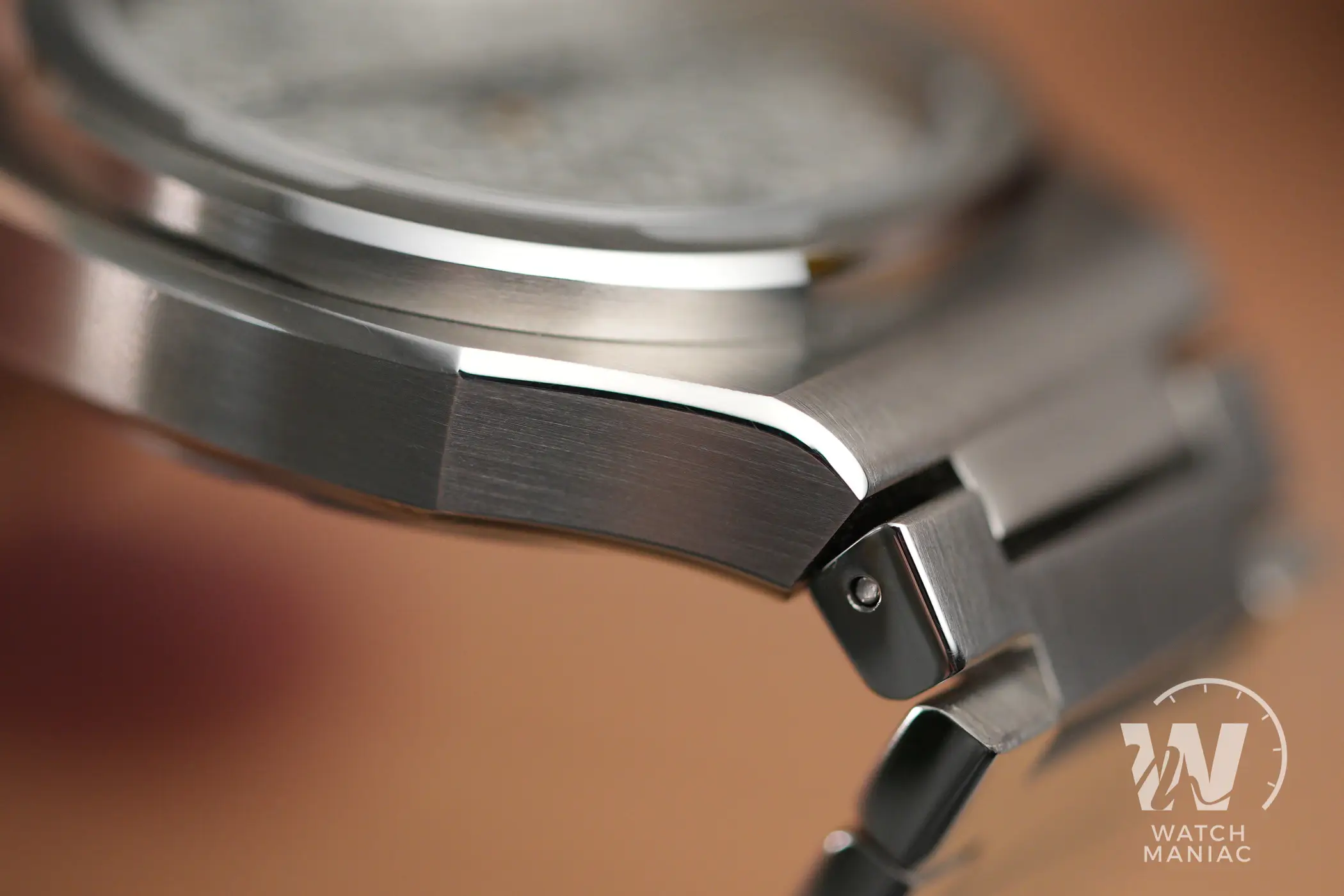 La cassa è sostanzialmente quella introdotta con il Wristmaster Traveller in edizione limitata. La forma è vagamente ottagonale ed è una reinterpretazione molto originale dello stile anni ’70. La lunetta ha spigoli smussati e sei incavi che le danno un carattere unico. Anche la carrure segue la stessa filosofia, con spigoli arrotondati e la parte superiore delle anse curva che si raccorda al bracciale. Le finiture sono molto curate, con satinature ben fatte e vistosi biselli lucidi in corrispondenza della lunetta e della carrure, sia in alto che in basso.