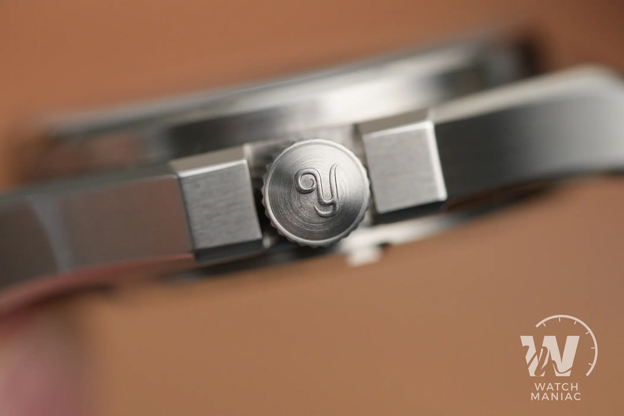 Dalla vista laterale l’Urban Traveller non è sottilissimo in senso assoluto, sia chiaro, ma tutto sommato lo spessore complessivo risulta equilibrato. La corona a ore 3 è parzialmente inglobata nella carrure, ha un diametro importante ma non sporge molto. Ha una finitura satinata con logo in rilievo ed è a pressione. Il fondello in acciaio è a vite e ha al centro una bella decorazione con lo stemma di Yema. Intorno, come di consueto, sono incise varie indicazioni tra cui il dato sull’impermeabilità fino a 10bar di pressione.