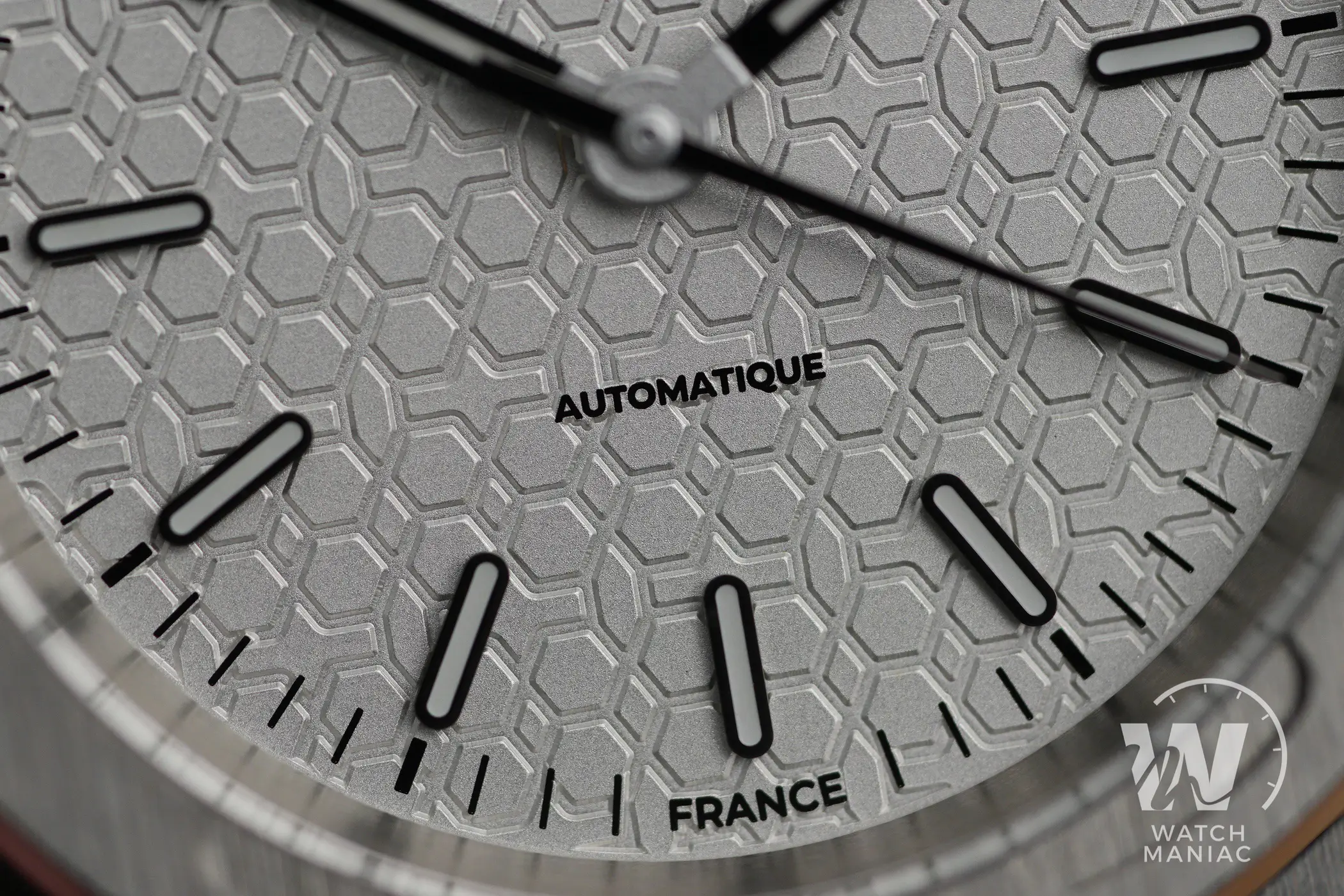 I nuovi Urban Traveller al momento sono disponibili in 5 varianti, con quadrante bianco/argentato, salmone, azzurro, nero e verde. Il colore chiaro della versione in prova potrebbe sembrare bianco in alcune condizioni di luce, ma in realtà è più che altro argentato con un effetto metallizzato piuttosto evidente. Ed è ancora pIù evidente la trama a nido d’ape, originale ed elaborata, che rende ricercato questo quadrante senza però ricadere sui classici motivi a tapisserie o a “clous de Paris”.